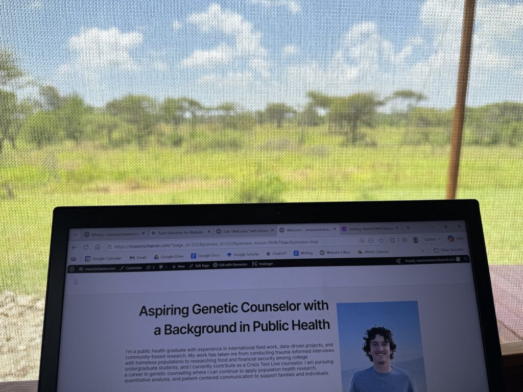 There isn’t much for me to say about yesterday. I stayed in the camp all day relaxing. It’s not exactly a resort; the purpose is to eat meals and sleep at, not entertain throughout the day—that’s what animals are for. Lucas had many tasks to deal with and I didn’t see him until 8:00 at night. My friends were all working, preparing for the guests, and they wouldn’t let me help, so I was a bit lonely. From around 7 a.m. until noon I did work on my computer. I’m very grateful there is WiFi, or else I would have been stuck reading all day. I took about an hour lunch until 1 p.m. and then went back to working. I’m getting pretty efficient at building my website now; most of today was dedicated to learning basic-intermediate tools, it wasn’t until later that I actually started putting content on my pages.