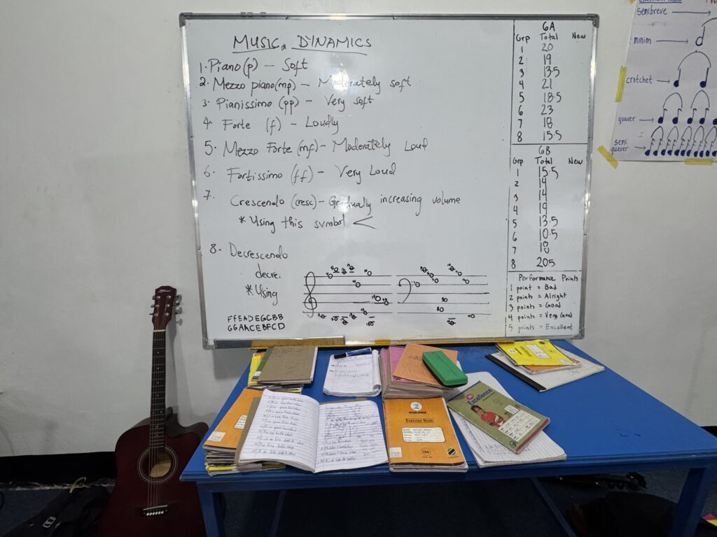 The school day was sloppy because it was the last day of school before the short Easter holiday. I’m not quite sure what the students did in classrooms—I think it was just copying holiday homework into their notebooks—as I was in the music room most of the day. Ezekia and I were able to practice with some of the star students before teachers started getting mad we were pulling kids from their classes. We did some marking while we could—there were many books we had to update with grades before all our students went home with homework over the break.