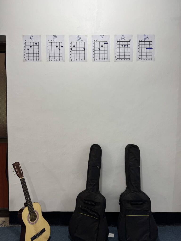 After parade I joined Ezekia in music. The first period we didn’t have any kids, so I finished my art project of drawing out some guitar chords and then taped them up. For the rest of the regular classes I was in music, teaching three classes of 8 year-olds three separate songs. The first got Twinkle Twinkle, the second attempted Mary Had a Little Lamb, and the third raved over Baby Shark. It’s very difficult because these young kids have almost no coordination with one hand on the fret board, let alone two trying to do two different tasks. It’s more of a learning experience for me than it is for them!