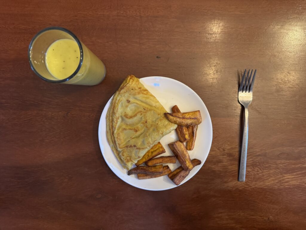 This is the sort of breakfast I have every day. This morning is a crepe with some green onion and then fried bananas. I have a glass of homemade juice with almost every meal I eat at home.